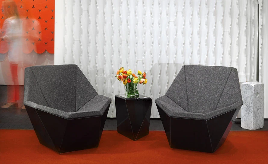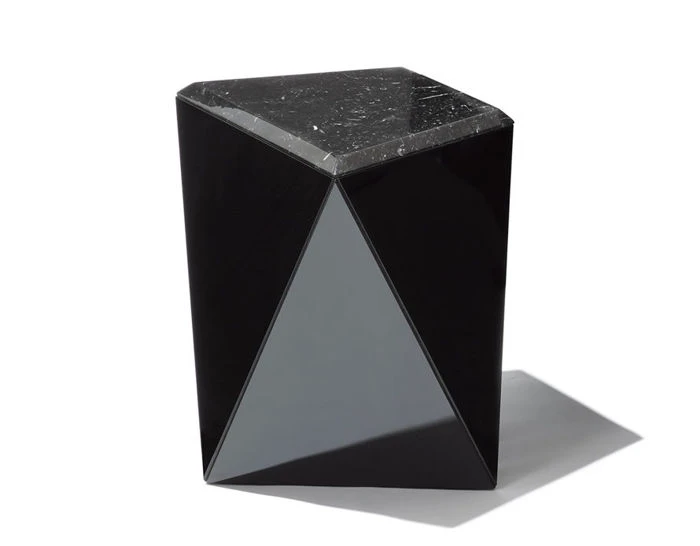 Designed by David Adjaye as part of the Washington Collection for Knoll, the Prism Side Table complements the Prism Lounge Chair and Ottoman, using geometry and pattern to define form. The pieces are intended as sculptural or architectural objects that can be viewed from any side. Each form consists of a color core laminate shell, available in red, white or black. This glossy finish contrasts with the marble on the table top.