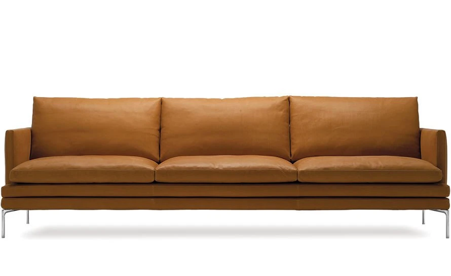 The William sofa collection features a steel frame with elastic strip suspension. The seat is upholstered wth polyurethane/heat-bound polyester fiber. The back and armrest upholstery is self-extinguishing polyurethane foam/heat-bound polyester fiber. Seat cushions are filled with goose down and polyurethane insert. Back cushions are filled with good down. Fixed internal nylon cover and cotton cover for the cushions. Removable external fabric or leather cover. The feet are aluminum alloy in either a polished, natural nickel-satin or black nickel-satin finish.